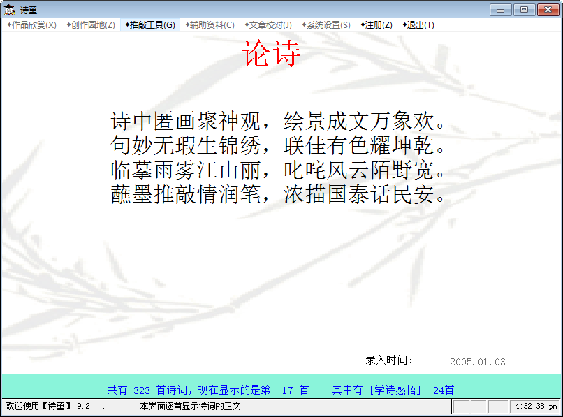 詩童是一款詩詞管理軟件,特別適合詩詞愛好者管理自己的詩詞作品、在[詩童]的協(xié)助下創(chuàng)作新作品、也可搜集整理自己喜愛的詩詞作品。具有詩詞作品管理、格律檢驗(yàn)、字詞句多能寶典、制作電子詩集等功能??梢苑奖愕拇蛴≥敵龌驈?fù)制到你正在編輯的其他文本中。下載后即可欣賞到軟件作者的詩詞作品,可以試用格律檢驗(yàn)、字詞句寶典。如果感覺好用,交費(fèi)注冊后就成為你自己詩詞的好管家。【軟件特點(diǎn)】
