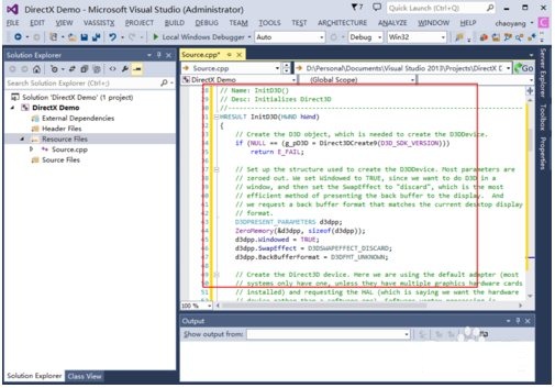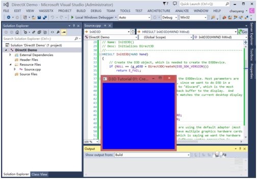 在安裝路徑D:\Program Files (x86)\Microsoft DirectX SDK (June 2010)\Samples\C++\Direct3D\Tutorials\Tut01_CreateDevice中打開下圖的文件,并將其中的代碼復制到上圖中的代碼區(qū)