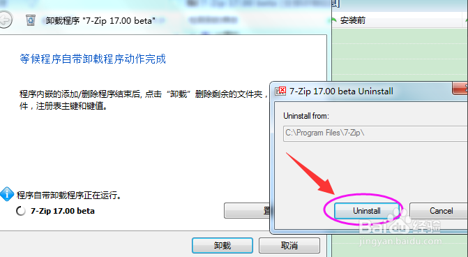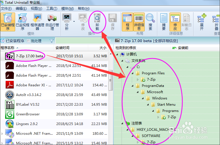 確定需要卸載左側(cè)7Z,右側(cè)所有的7Z的文件夾和注冊(cè)表大致是對(duì)的,點(diǎn)擊菜單頂上的卸載