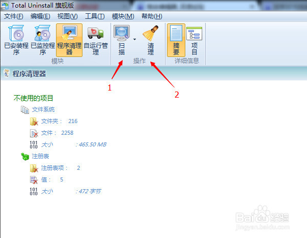 Total同樣具備清理軟件垃圾的能力,我們點(diǎn)擊程序清潔器,然后再單擊掃描就可以對(duì)已安裝的軟件進(jìn)行分析。分析后點(diǎn)擊清理就完成了對(duì)這個(gè)軟件垃圾的清理