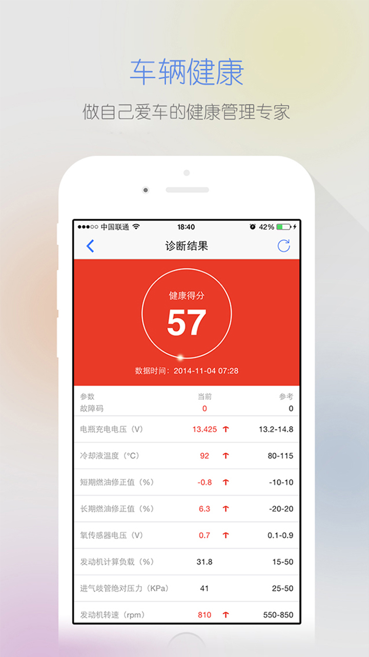 實時獲取車況健康情況,健康?故障?異常?還能詳細展示各項車況指標(電壓、冷卻液溫度、燃油修正值、發(fā)動機負載等)的診斷數(shù)值及對應(yīng)的曲線分析,輕松做自己愛車的健康管理專家。