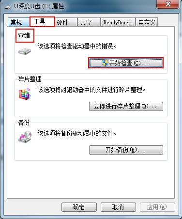2、進(jìn)入“u盤(pán)屬性”頁(yè)面中,選擇查錯(cuò)中的“開(kāi)始檢查”選項(xiàng)。