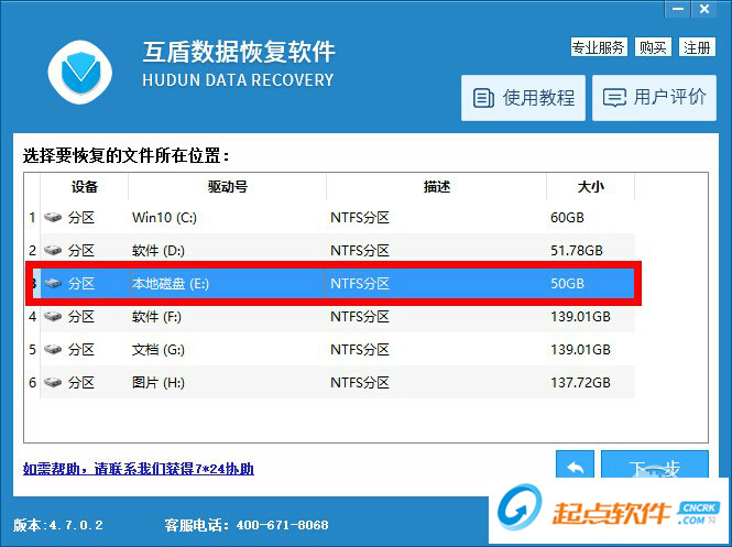 2、選擇丟失文件所在盤,點(diǎn)擊下一步。