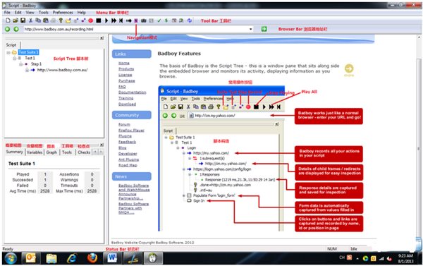 2. 點擊圖標,你將看到Badboy的IDE界面,下圖是我對界面進行的簡單注解,其中包括Badboy官網(wǎng)的一個介紹截圖