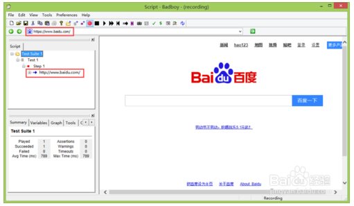 4、以登陸百度為例錄制腳本,輸入百度網(wǎng)址后敲回車,即進入百度界面。