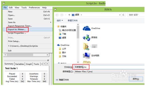 點擊File→Export to JMeter...→另存為"百度登陸.jmx"→保存。