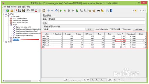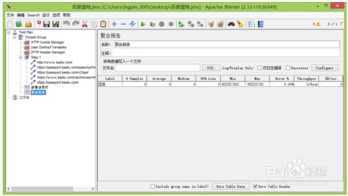 注:百度網(wǎng)站安全級別高,將錄制的腳本直接重新運行會出現(xiàn)相應(yīng)異常,故此查看結(jié)構(gòu)樹和聚合報告都有異常。需做相應(yīng)配置即可成功登陸。
