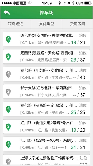 上海停車app停車場(chǎng)的實(shí)時(shí)可供停車的泊位數(shù)量用綠色、橘黃色、紅色三色表示。綠色表示該停車場(chǎng)目前可供停車的泊位還占整個(gè)停車場(chǎng)的50%以上;橘黃色表示有10%到50%的泊位可供停車;紅色表示目前尚有5%以下的泊位可供停車。