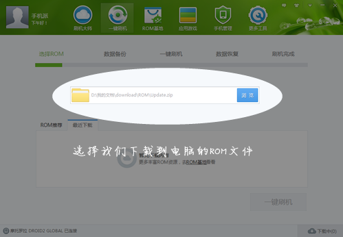 3、刷機(jī)大師,顧名思義,主要就是刷機(jī)的工具,所以刷機(jī)的使用絕對(duì)不可遺漏。點(diǎn)擊界面頂部的“一鍵刷機(jī)”按鈕,然后點(diǎn)擊“瀏覽”按鈕選擇已經(jīng)下載好的ROM包進(jìn)行刷機(jī)操作,沒有下載刷機(jī)包的用戶可以點(diǎn)擊“去ROM基地”下載ROM。