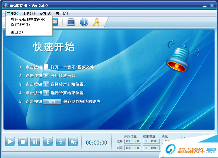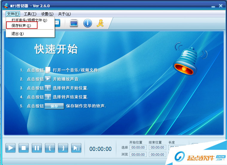 4、下方功能圖標(biāo)分別是:“播放”、“停止”、“暫?!薄ⅰ斑x擇鈴聲起始位置”、“選擇鈴聲結(jié)束位置”、“播放選擇段落”。