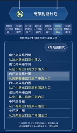 可以查看近一周內(nèi)的高架道路封路情況,以便及時調(diào)整出行方案,合理安排行車路線。