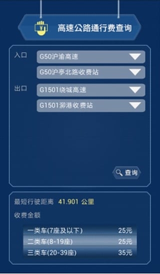 可以查詢上海地區(qū)的高速公路通行費,提供十一類不同類型車的費用信息。