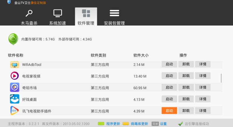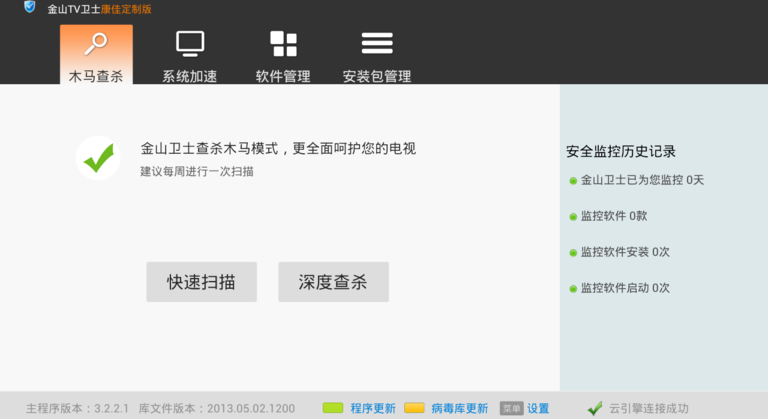 金山衛(wèi)士是一款由金山網(wǎng)絡技術有限公司出品的查殺木馬能力強、檢測漏洞快、體積小巧的免費安全軟件。它采用金山領先的云安全技術,不僅能查殺上億已知木馬,還能5分鐘內發(fā)現(xiàn)新木馬;漏洞檢測針對電視優(yōu)化,速度更快;更有實時保護、插件清理,全面保護電視的系統(tǒng)安全。【軟件功能】