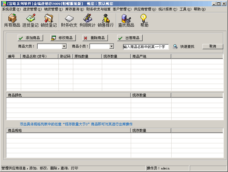 金瑞進(jìn)銷(xiāo)存2010,是一款專(zhuān)為中小型店鋪設(shè)計(jì)的銷(xiāo)售管理軟件,其中包含商品進(jìn)貨登記、進(jìn)貨退庫(kù)、商品銷(xiāo)售登記、銷(xiāo)貨退回、庫(kù)存管理、收支管理、應(yīng)收應(yīng)付管理、用戶管理、帳套管理、財(cái)務(wù)結(jié)算、營(yíng)業(yè)員提成(營(yíng)業(yè)員提成有按銷(xiāo)售數(shù)量和按銷(xiāo)售金額提成)、銷(xiāo)售排行榜和強(qiáng)大的報(bào)表系統(tǒng),及強(qiáng)大的會(huì)員管理(生日提醒)等子模塊。