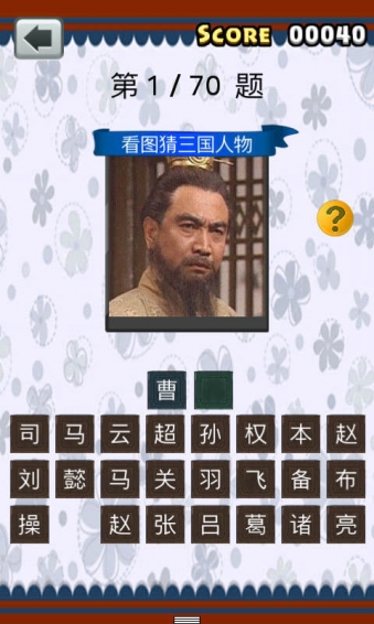 《三國演義》是中國四大名著之一,描寫了從東漢末年到西晉初年之間近100年的歷史風云。全書反映了三國時代的政治軍事斗爭,反映了三國時代各類社會矛盾的轉化,并概括了這一時代的歷史巨變,塑造了一批叱咤風云的英雄人物。《三國人物猜猜看》是一個看圖猜人的游戲,本游戲收錄了老版電視劇里的人物,猜三國人物看看你是不是三國迷。