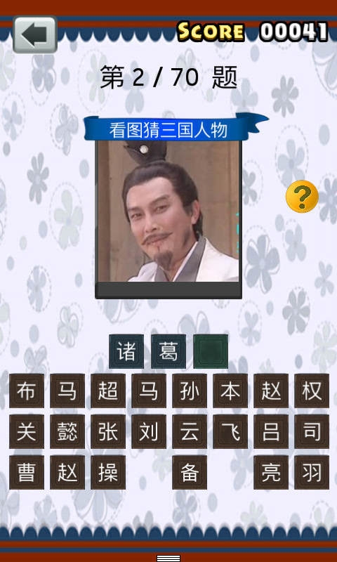 三國人物猜猜看手游是一款簡單有趣的休閑益智類手機游戲,游戲以三國演義人物為核心,游戲中將會給出三國里面所有知名人物的頭像,讓玩家去辨別這個人物是誰,從而加深對三國更深刻的了解!