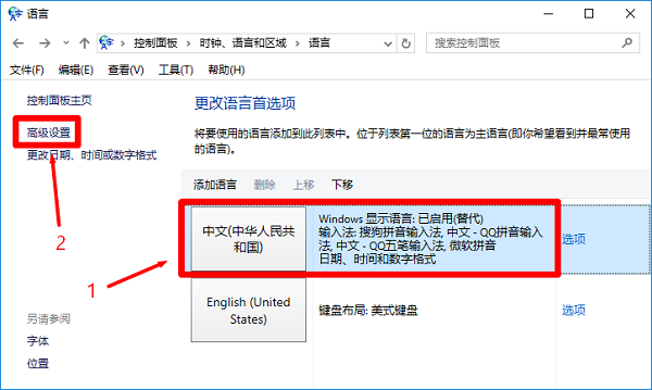 4、打開“高級設(shè)置”選項先點擊“中文(中華人們共和國)”這個選項——>然后點擊左側(cè)的“高級設(shè)置”選項。如下圖所示: