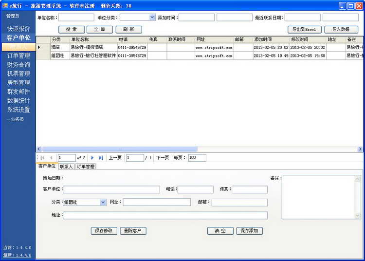 E游旅行社管理軟件是一款小巧又專業(yè)的旅行社管理系統(tǒng)軟件。嚴(yán)謹(jǐn)度高、性能穩(wěn)定、實用性強(qiáng)、性價比高!還曾被評為“2009年度實用型行業(yè)軟件金獎”。