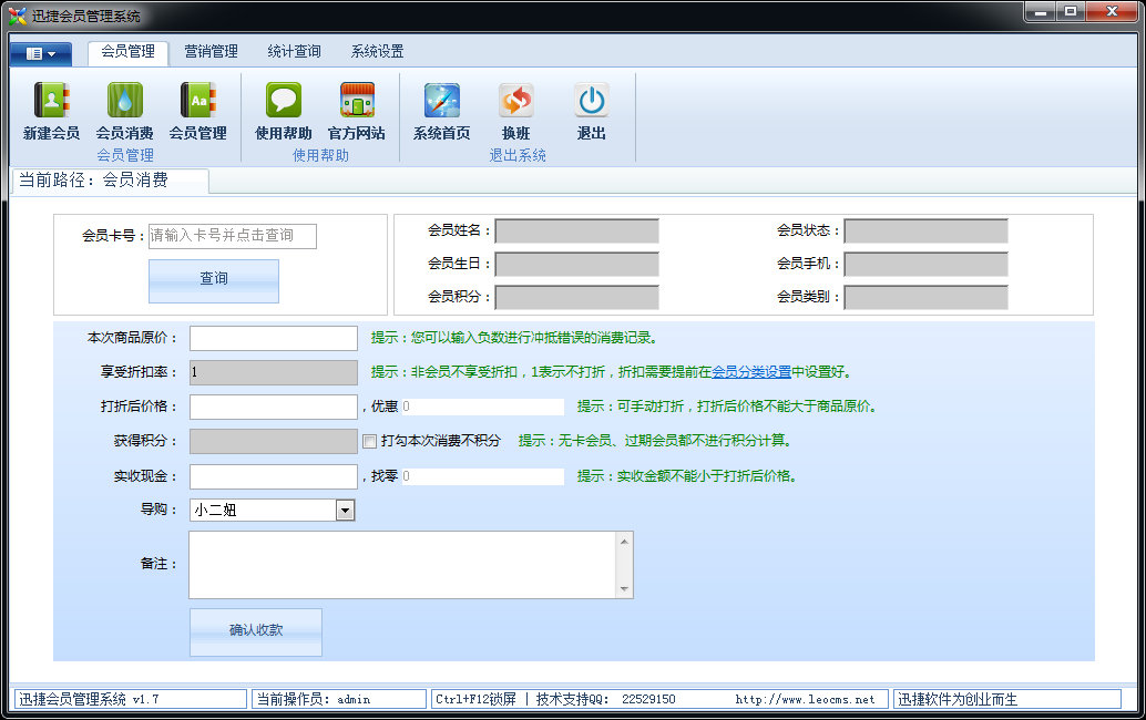 迅捷會(huì)員管理系統(tǒng)是以方便、快捷為宗旨,致力于中小企業(yè)為會(huì)員提供更優(yōu)質(zhì)的服務(wù)而開發(fā)的一套會(huì)員管理系統(tǒng),軟件功能分為會(huì)員信息、消費(fèi)記錄、消費(fèi)統(tǒng)計(jì)、消費(fèi)積分、生日提醒、群發(fā)短信、事件提醒、會(huì)員統(tǒng)計(jì)、短信統(tǒng)計(jì)等眾多功能。