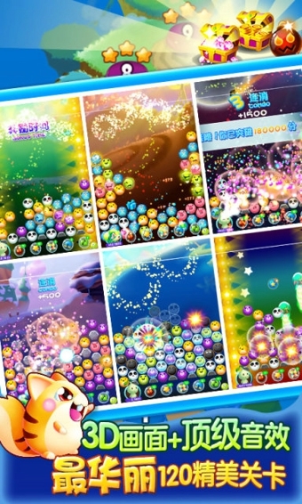 3D畫面+激萌音效!4只神奇助戰(zhàn)寵物,5個(gè)超炫消除道具,6只動(dòng)物泡泡,120個(gè)精美關(guān)卡,讓你視覺(jué)聽(tīng)覺(jué)同享超爽體驗(yàn)~