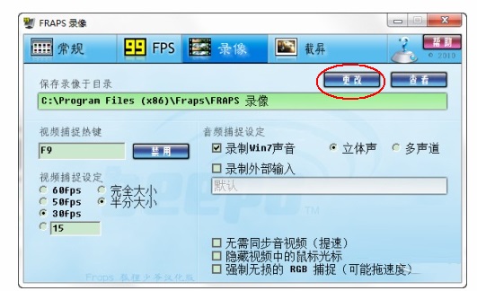 2、在fraps簡(jiǎn)體中文版中選擇保存錄像的位置,由于文件較大,建議不要裝在C盤,更換位置,點(diǎn)擊更改。