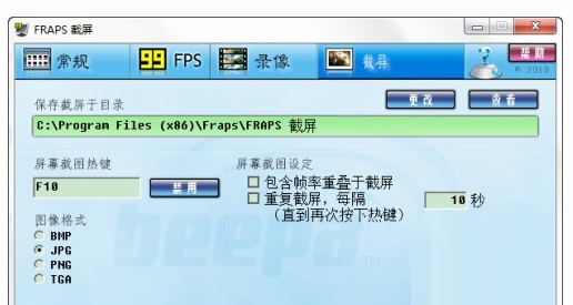 先運(yùn)行Fraps軟件,進(jìn)入游戲后按快捷鍵(默認(rèn)F10)就可截圖。截圖時(shí)還可以選擇截圖格式(推薦png,是無損壓縮的格式)、截圖包含幀數(shù)、連續(xù)截圖的頻率等。 截圖默認(rèn)保存在Fraps安裝目錄下的“screenshots”文件夾。