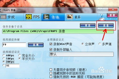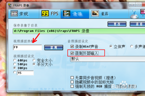 1、打開fraps,切換到錄像,默認(rèn)的錄像快捷鍵是F9,如果要修改的話,點(diǎn)擊“禁用”,然后按鍵盤上要設(shè)置的熱鍵就可以更改了