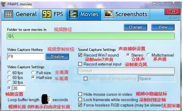 先運(yùn)行Fraps軟件,進(jìn)入游戲后按快捷鍵(默認(rèn)F9)開始錄制,可以看到游戲左上角的黃色數(shù)字變成了紅色,這就說明Fraps軟件已經(jīng)開始錄了,再按下F9鍵即可停止。如果要同時(shí)錄制聲音,要勾選Record sound(錄制聲音),還可以選擇Hide mouse cursor in video(隱藏視頻文件中的鼠標(biāo)光標(biāo))。視頻默認(rèn)保存在Fraps安裝目錄下的“movies”文件夾。