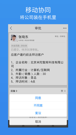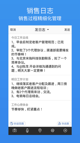 企業(yè)管理者用手機(jī)就能隨時隨地查看公司運(yùn)行狀況、審批文件、查閱和點(diǎn)評員工日志、實時了解一線銷售和客戶服務(wù)動態(tài)、查看企業(yè)銷售效率分析圖表等。