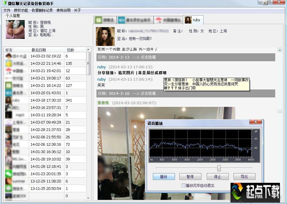 3:多標(biāo)簽、多類型聊天記錄查看 仿QQ聊天查看窗口,直接查看文字、圖片、推送內(nèi)容等,點(diǎn)擊語(yǔ)音播放,還可以一邊播放語(yǔ)音一邊查看聊天內(nèi)容!更多小功能等您來(lái)使用。