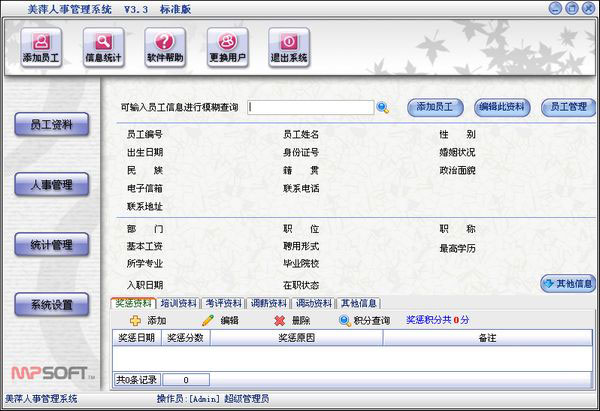 統(tǒng)計(jì)管理:對(duì)員工的資料進(jìn)行綜合信息統(tǒng)計(jì)、員工積分統(tǒng)計(jì)、人事記錄統(tǒng)計(jì)、人事信息統(tǒng)計(jì)