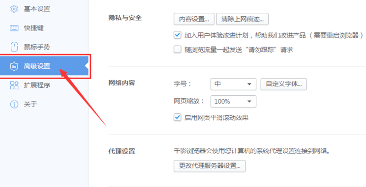 進(jìn)入高級(jí)設(shè)置界面找到【隱私與安全】中的【內(nèi)容設(shè)置】點(diǎn)擊進(jìn)入