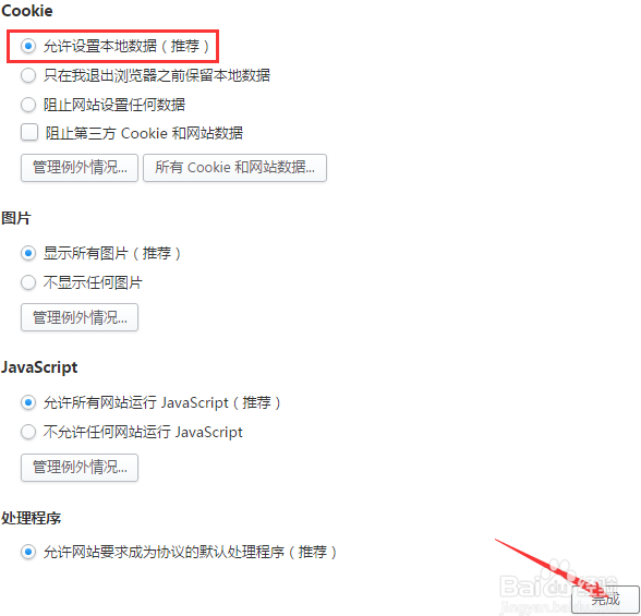 進(jìn)入內(nèi)容設(shè)置界面就可以看到【Cookie】在其中找到【只在我退出瀏覽器之前保留本地?cái)?shù)據(jù)】并在其前面打上點(diǎn),最后點(diǎn)擊【完成】