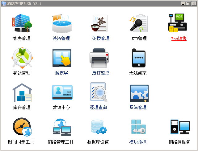 1、界面功能模塊概況-----界面美觀,模塊獨(dú)立,操作簡單,權(quán)限分明。主要模塊包括:客房管理、餐飲管理、洗浴管理、POS銷售、營銷中心、經(jīng)理查詢、庫存管理、無線點(diǎn)菜、觸摸屏、廚打監(jiān)控、數(shù)據(jù)庫設(shè)置等。