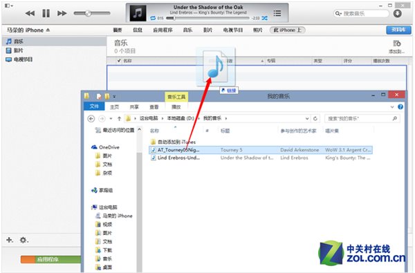 此外也可以直接將電腦中的音樂(lè)文件拖拽到iTunes右側(cè)的窗口中,音樂(lè)會(huì)全部復(fù)制到iPhone中。