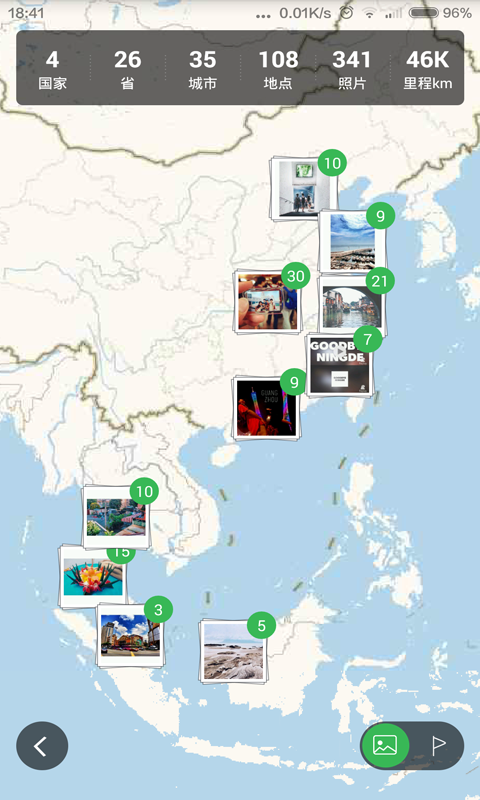 Place會把你標(biāo)注了地點的照片在地圖上標(biāo)記出來,你可以方便地查看自己去過幾個國家?guī)讉€省市,并自動生成足跡地圖。