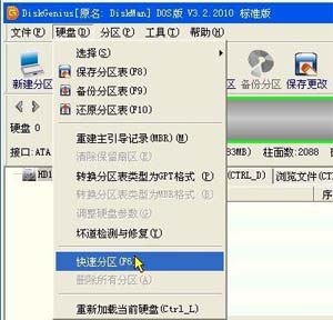 下面來看一下Diskgenius的快速分區(qū)功能,可以一次把需要的分區(qū)分好,依次點(diǎn)擊菜單硬盤——快速分區(qū),如果沒有鼠標(biāo),可以使用ALT+D方式打開快速分區(qū)菜單,如下圖: