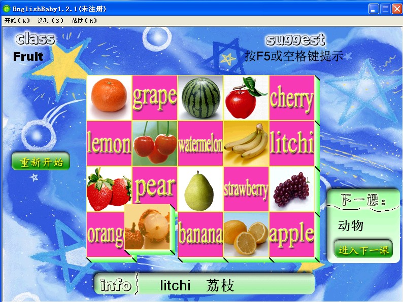 英語小子是一款寓教于樂、圖文語音并貌的學習型軟件(1.1版本后加入朗讀發(fā)音),英語小子采用了經(jīng)典的“少兒識字”教學思路(看圖識字),伴隨著標準的國際英語發(fā)音,讓兒童學習英語變成美好且難忘的記憶!當鼠標移動于漂亮的圖片和醒目的單詞之間時,當美妙標準的發(fā)音傳到耳際時,您會發(fā)現(xiàn)原來記憶單詞并不難,學習英文可以這般的輕松美妙。