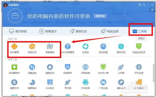 喜歡使用QQ安全管家修復(fù)和漏洞、軟件管理和電腦診所3個功能的朋友,在打開新版本后,肯定兩眼一蒙,找不到這兩個功能了,其實這兩個功能還是一直存在的,打開工具箱后,就可以看到這3個功能了