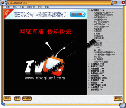 Nqlive網(wǎng)絡(luò)電視起初是Nbaqiumi網(wǎng)為方便球迷看比賽而研發(fā)的專門看體育直播的一款網(wǎng)絡(luò)電視,聚合了所有常用、能用且好用的p2p網(wǎng)絡(luò)電視核心(非軟件),通過它,可以看到幾乎所有的體育頻道,比如CSPN、上海體育、廣東體育、彩富體育、泰星、ESPN、衛(wèi)視體育、FSC、TNT、FSN、福克斯體育、NBA直播、新浪英超、中超、騰訊英超、悠視意甲、網(wǎng)易直播、CCTV5、CCTV風(fēng)云足球、高爾夫網(wǎng)球、天元圍棋、歐洲體育、歐洲足球等等……,后來根據(jù)網(wǎng)友建議,不斷完善補(bǔ)充,目前Nqlive已經(jīng)十分成熟,包括【體育頻道】【CCTV】【全國衛(wèi)視】【英超歐冠】【悠視意甲】【全國地方電臺】【財經(jīng)頻道】【港澳臺】【國外電視臺】【補(bǔ)充頻道】十大模塊。
