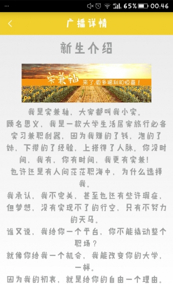 實(shí)兼軸是一款非常實(shí)用的大學(xué)生兼職軟件,大學(xué)生活有著非常充裕的時間,大學(xué)生們可用這款軟件尋找各種兼職,并在學(xué)習(xí)的同時賺取零花錢,也算是為辛苦的家人分擔(dān)一點(diǎn)生活上的壓力,同時獲取一些工作的經(jīng)驗(yàn)。