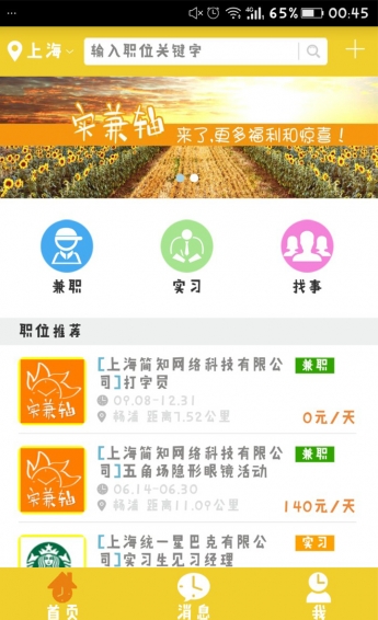 除了海量靠譜兼職和名企實(shí)習(xí)外,實(shí)兼軸千錘百煉打造出大學(xué)生新玩法——找事功能,不僅能讓你玩著做兼職,更有機(jī)會邂(gou)逅(da)男/女神你就偷著樂吧!為了更有質(zhì)量的大學(xué)生活,有事兒您說話!