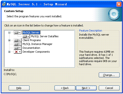 在此改變MySQL的安裝目錄,單擊change
