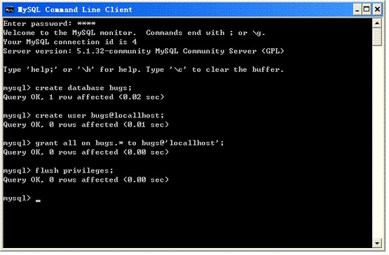 下面在MySQL服務(wù)器中創(chuàng)建一個(gè)bugs數(shù)據(jù)庫,和一個(gè)bugs用戶,以及為該用戶授予相應(yīng)的權(quán)限,命令如下: