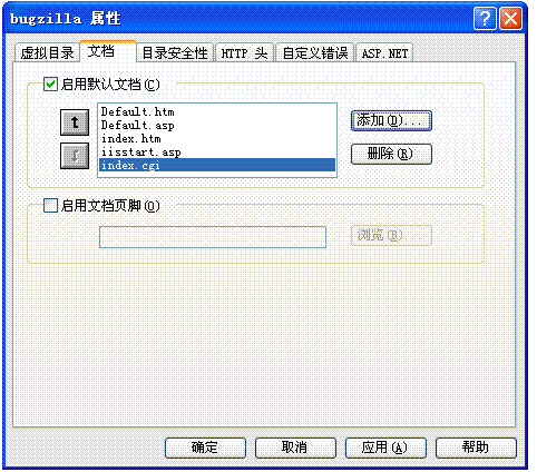 在bugzilla屬性對(duì)話框中選擇文檔,在默認(rèn)文檔中選中添加