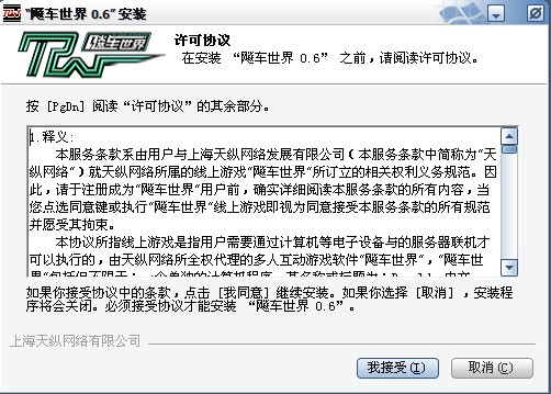 這一步是關(guān)于 《飚車世界》游戲的用戶條款。請(qǐng)務(wù)必閱讀條款,閱讀后如果同意,則點(diǎn)擊“我接受”按鈕,進(jìn)行下面的安裝作業(yè)。