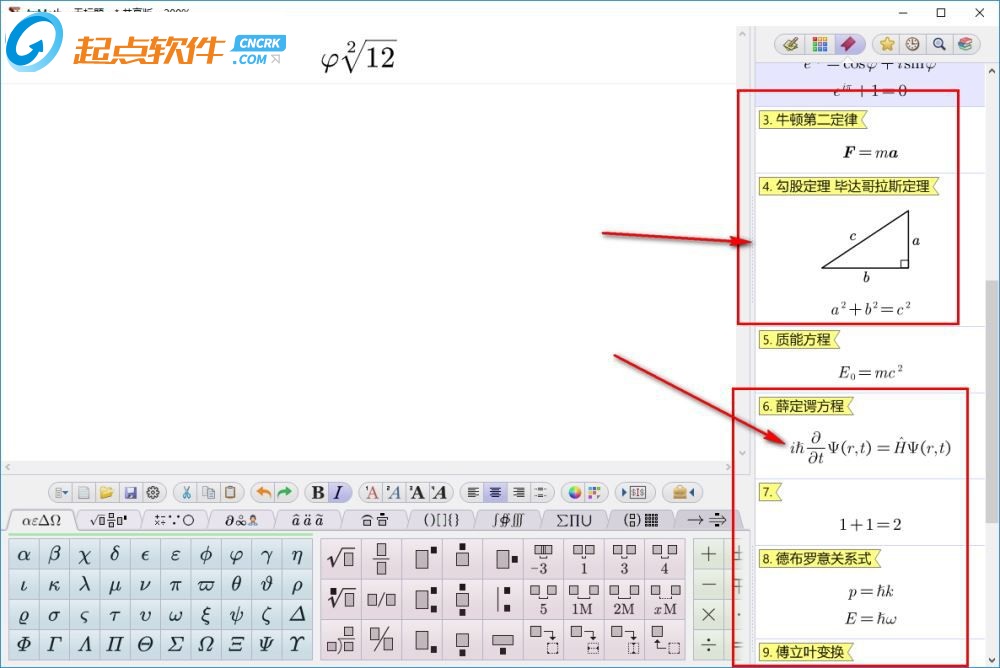點擊右邊,可以查看更多的公式,這里提供牛頓第二定律、勾股定理、畢達哥拉斯定理、質(zhì)能方程、薛定諤方程