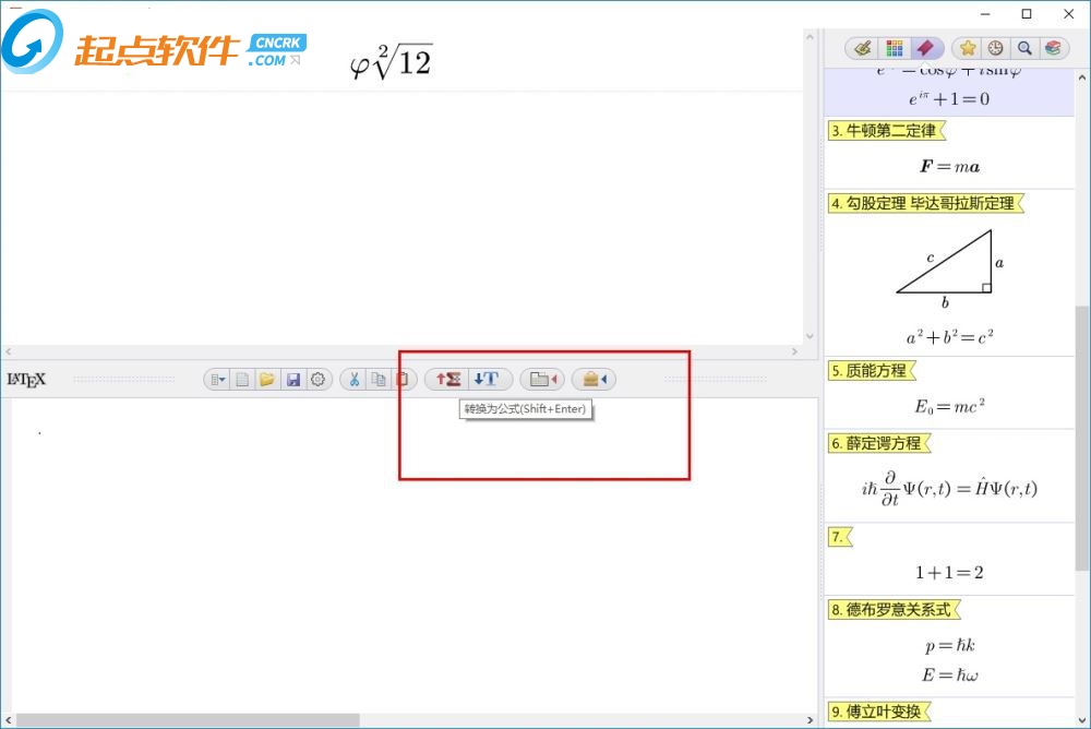 點擊工具欄按鈕或按下快捷鍵“CTRL+Tab”切換至LaTeX編輯模式。此時界面底部的工作區(qū)為文本編輯區(qū),此處輸入LaTeX腳本后,點擊工具欄按鈕或按下快捷鍵“SHIFT+ENTER”把LaTeX腳本轉(zhuǎn)換為公式。