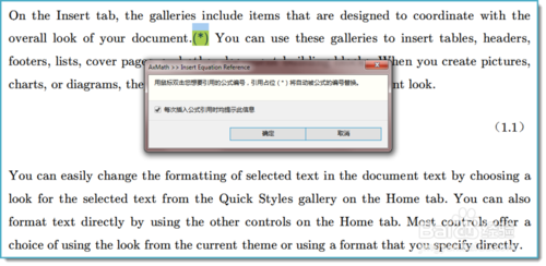第2步,點擊AxMath插件菜單按鈕“插入引用”,在光標處將會插入引用標記,顯示為“(*)”,若系統(tǒng)有提示對話框,則點擊確定。