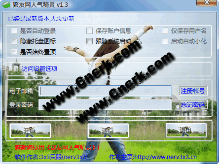 <<聚友網(wǎng)人氣精靈>>采用封包發(fā)送,自動(dòng)刷新個(gè)人主頁(yè)的形式,直接提升您的聚友網(wǎng)主頁(yè)的訪(fǎng)問(wèn)人氣.與目前網(wǎng)上已有的一些通用的自動(dòng)刷新程序相比,<<聚友網(wǎng)人氣精靈>>專(zhuān)門(mén)針對(duì)聚友網(wǎng)用戶(hù)而設(shè)計(jì),拋棄了通用刷新程序模擬人工刷新的方法,而是獨(dú)樹(shù)一幟地采用了底層的封包發(fā)送自動(dòng)刷新的方法(可以設(shè)定刷新間隔),占用資源更少,刷新效率更高